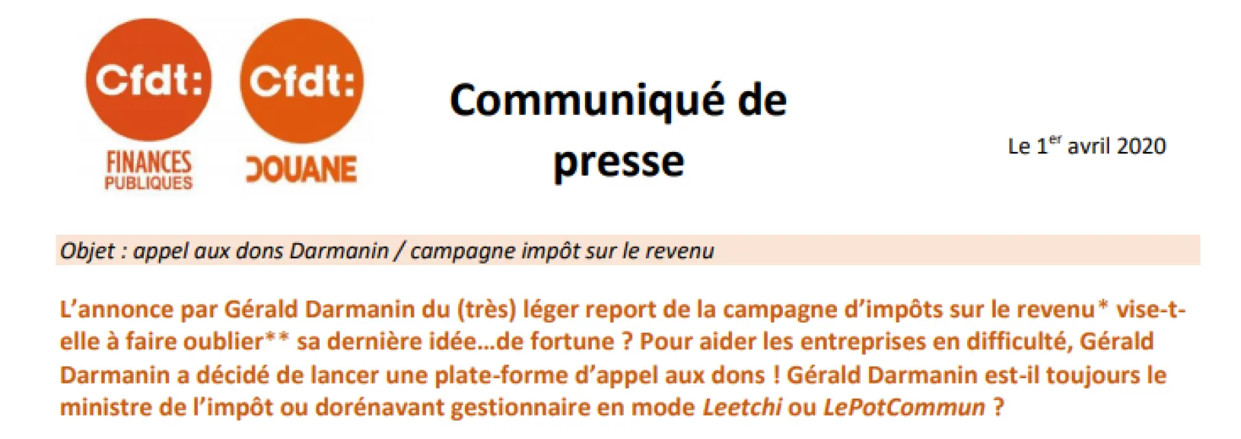 Communiqué de presse de la CFDT Finances publiques et de la CFDT Douane suite à l'appel incongru aux dons du ministre Darmanin ...et l'annonce (avancée) du lancement (repoussé) de la campagne d'impôt sur le revenu.