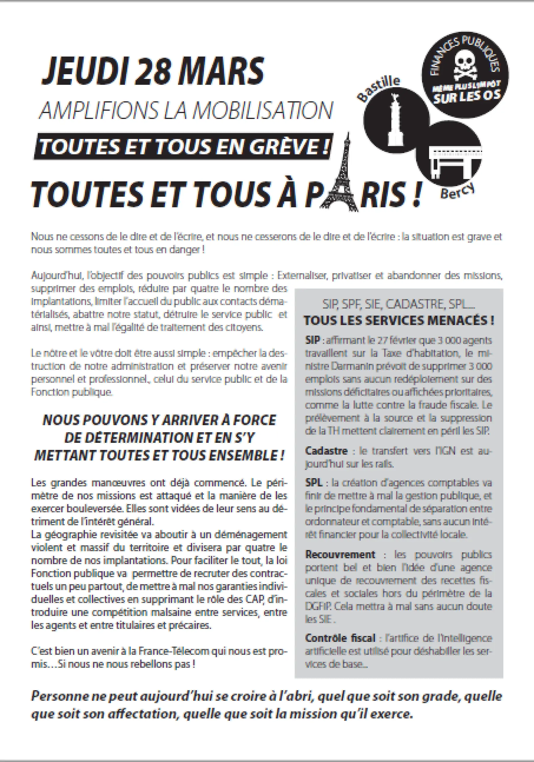 Les cinq premières organisations syndicales du la DGFiP appèlent les personnels à venir manifester le 28 mars à Paris.