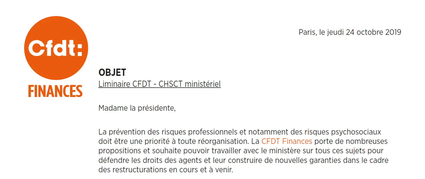 Dans ce contexte, la CFDT Finances a donc fait le choix responsable de siéger seule au CHSCTM du 24/10/2019 afin de porter nos propositions concrètes d’améliorations des conditions de vie au travail des agents des Ministères économiques et financiers.