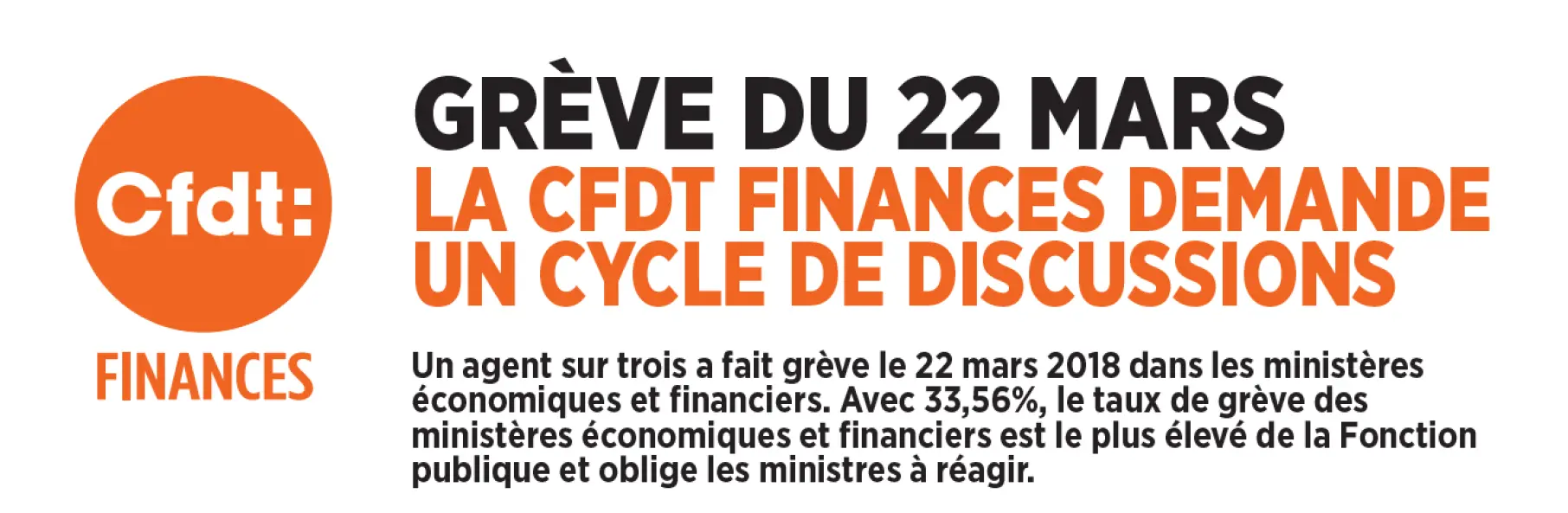 Un agent sur trois a fait grève le 22 mars 2018 dans les ministères économiques et financiers. Avec 33,56%, le taux de grève des ministères économiques et financiers est le plus élevé de la Fonction publique et oblige les ministres à réagir. La CFDT Finances demande l’ouverture d’un cycle de discussion sur les missions, les moyens, les garanties pour les personnels et le pouvoir d'achat.