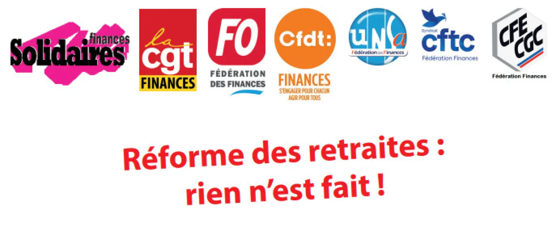 Les fédérations SOLIDAIRES – CGT – CFDT / CFTC – FO – UNSA / CGC appellent, en toute indépendance, l’ensemble des agents à participer massivement à la journée de grève et de manifestations du 23 mars pour le retrait de cette réforme.